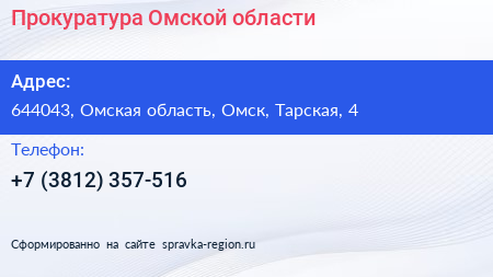 Прокуратура Омской области по адресу 644043, Омская область, Омск, Тарская, 4 в дальнейшем Организация, размещена в следующих категориях: