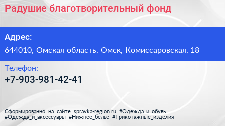 Радушие, благотворительный фонд по адресу 644010, Омская область, Омск, Комиссаровская, 18 в дальнейшем Организация, размещена в следующих категориях:
