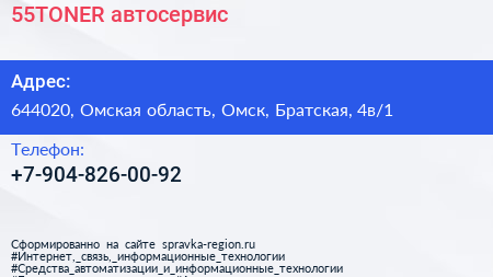 55TONER, автосервис по адресу 644020, Омская область, Омск, Братская, 4в/1 в дальнейшем Организация, размещена в следующих категориях: