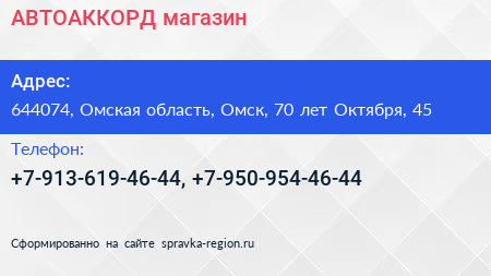 АВТОАККОРД, магазин по адресу 644074, Омская область, Омск, 70 лет Октября, 45 в дальнейшем Организация, размещена в следующих категориях: