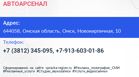 АВТОАРСЕНАЛ по адресу 644058, Омская область, Омск, Новокирпичная, 10 в дальнейшем Организация, размещена в следующих категориях: