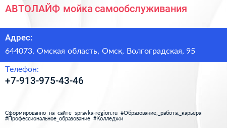 АВТОЛАЙФ, мойка самообслуживания по адресу 644073, Омская область, Омск, Волгоградская, 95 в дальнейшем Организация, размещена в следующих категориях: