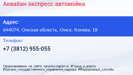 Аквабан, экспресс-автомойка по адресу 644074, Омская область, Омск, Конева, 18 в дальнейшем Организация, размещена в следующих категориях: