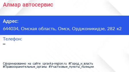 Алмар, автосервис по адресу 644034, Омская область, Омск, Орджоникидзе, 282 к2 в дальнейшем Организация, размещена в следующих категориях: