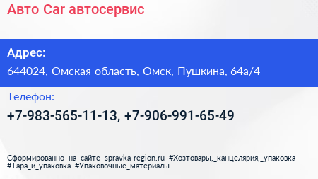 Авто Car, автосервис по адресу 644024, Омская область, Омск, Пушкина, 64а/4 в дальнейшем Организация, размещена в следующих категориях: