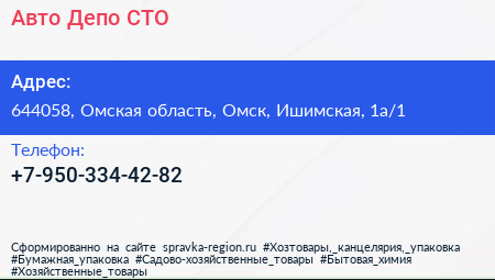 Авто Депо, СТО по адресу 644058, Омская область, Омск, Ишимская, 1а/1 в дальнейшем Организация, размещена в следующих категориях: