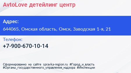 AvtoLove, детейлинг-центр по адресу 644065, Омская область, Омск, Заводская 1-я, 21 в дальнейшем Организация, размещена в следующих категориях:
