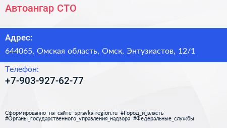 Автоангар, СТО по адресу 644065, Омская область, Омск, Энтузиастов, 12/1 в дальнейшем Организация, размещена в следующих категориях: