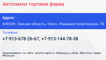 Автоэмали, торговая фирма по адресу 644109, Омская область, Омск, Машиностроительная, 78 в дальнейшем Организация, размещена в следующих категориях: