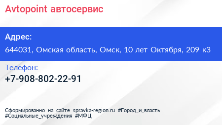 Avtopoint, автосервис по адресу 644031, Омская область, Омск, 10 лет Октября, 209 к3 в дальнейшем Организация, размещена в следующих категориях: