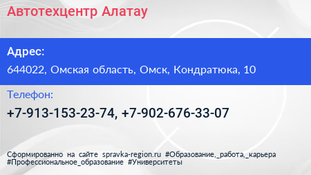 Автотехцентр Алатау по адресу 644022, Омская область, Омск, Кондратюка, 10 в дальнейшем Организация, размещена в следующих категориях: