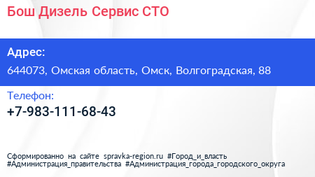 Бош Дизель Сервис, СТО по адресу 644073, Омская область, Омск, Волгоградская, 88 в дальнейшем Организация, размещена в следующих категориях: