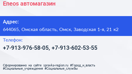 Eneos, автомагазин по адресу 644065, Омская область, Омск, Заводская 1-я, 21 к2 в дальнейшем Организация, размещена в следующих категориях: