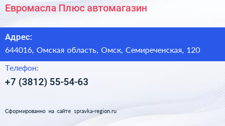 Евромасла Плюс, автомагазин по адресу 644016, Омская область, Омск, Семиреченская, 120 в дальнейшем Организация, размещена в следующих категориях: