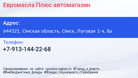 Евромасла Плюс, автомагазин по адресу 644521, Омская область, Омск, Луговая 1-я, 8а в дальнейшем Организация, размещена в следующих категориях: