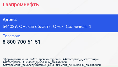 Газпромнефть по адресу 644039, Омская область, Омск, Солнечная, 1 в дальнейшем Организация, размещена в следующих категориях: