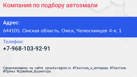 Компания по подбору автоэмали по адресу 644105, Омская область, Омск, Челюскинцев 4-я, 1 в дальнейшем Организация, размещена в следующих категориях: