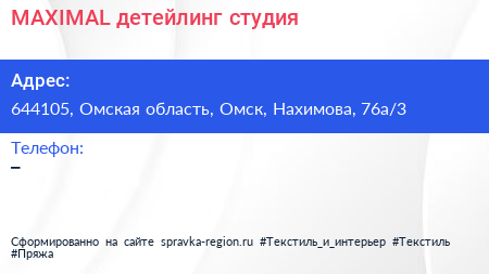MAXIMAL, детейлинг-студия по адресу 644105, Омская область, Омск, Нахимова, 76а/3 в дальнейшем Организация, размещена в следующих категориях: