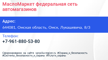 МаслоМаркет, федеральная сеть автомагазинов по адресу 644081, Омская область, Омск, Лукашевича, 8/3 в дальнейшем Организация, размещена в следующих категориях: