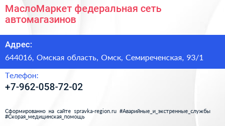 МаслоМаркет, федеральная сеть автомагазинов по адресу 644016, Омская область, Омск, Семиреченская, 93/1 в дальнейшем Организация, размещена в следующих категориях:
