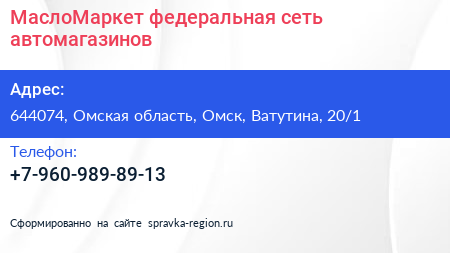 МаслоМаркет, федеральная сеть автомагазинов по адресу 644074, Омская область, Омск, Ватутина, 20/1 в дальнейшем Организация, размещена в следующих категориях: