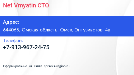 Net-Vmyatin, СТО по адресу 644065, Омская область, Омск, Энтузиастов, 4в в дальнейшем Организация, размещена в следующих категориях: