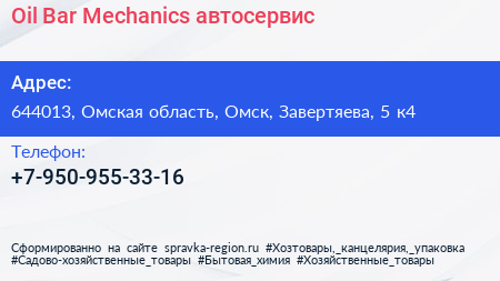 Oil-Bar Mechanics, автосервис по адресу 644013, Омская область, Омск, Завертяева, 5 к4 в дальнейшем Организация, размещена в следующих категориях:
