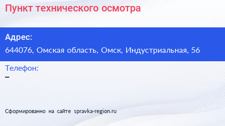 Пункт технического осмотра по адресу 644076, Омская область, Омск, Индустриальная, 56 в дальнейшем Организация, размещена в следующих категориях: