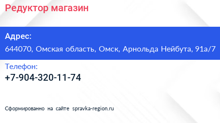 Редуктор, магазин по адресу 644070, Омская область, Омск, Арнольда Нейбута, 91а/7 в дальнейшем Организация, размещена в следующих категориях: