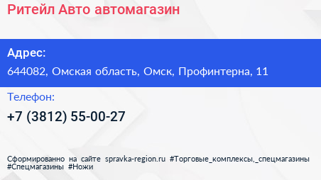 Ритейл Авто, автомагазин по адресу 644082, Омская область, Омск, Профинтерна, 11 в дальнейшем Организация, размещена в следующих категориях: