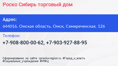Роско-Сибирь, торговый дом по адресу 644016, Омская область, Омск, Семиреченская, 126 в дальнейшем Организация, размещена в следующих категориях:
