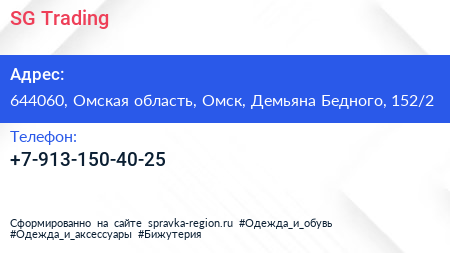SG Trading по адресу 644060, Омская область, Омск, Демьяна Бедного, 152/2 в дальнейшем Организация, размещена в следующих категориях: