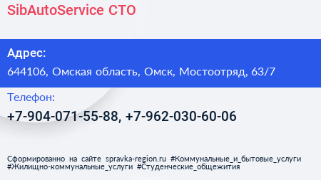SibAutoService, СТО по адресу 644106, Омская область, Омск, Мостоотряд, 63/7 в дальнейшем Организация, размещена в следующих категориях: