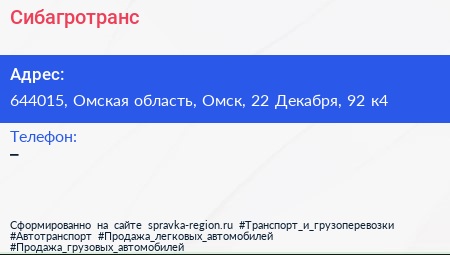Сибагротранс по адресу 644015, Омская область, Омск, 22 Декабря, 92 к4 в дальнейшем Организация, размещена в следующих категориях: