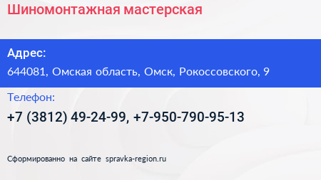 Шиномонтажная мастерская по адресу 644081, Омская область, Омск, Рокоссовского, 9 в дальнейшем Организация, размещена в следующих категориях: