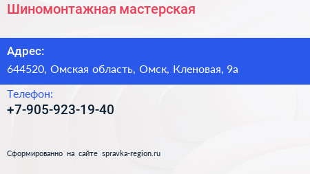 Шиномонтажная мастерская по адресу 644520, Омская область, Омск, Кленовая, 9а в дальнейшем Организация, размещена в следующих категориях: