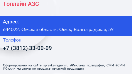 Топлайн, АЗС по адресу 644022, Омская область, Омск, Волгоградская, 59 в дальнейшем Организация, размещена в следующих категориях: