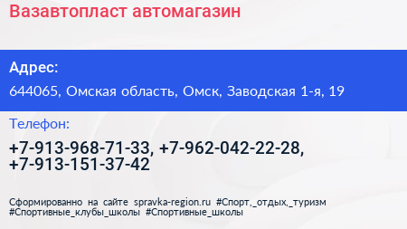 Вазавтопласт, автомагазин по адресу 644065, Омская область, Омск, Заводская 1-я, 19 в дальнейшем Организация, размещена в следующих категориях:
