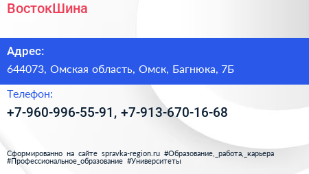 ВостокШина по адресу 644073, Омская область, Омск, Багнюка, 7Б в дальнейшем Организация, размещена в следующих категориях: