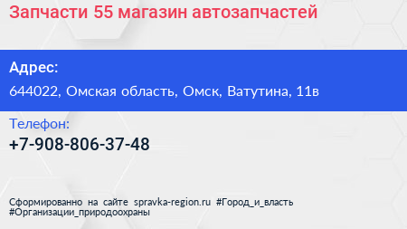 Запчасти 55, магазин автозапчастей по адресу 644022, Омская область, Омск, Ватутина, 11в в дальнейшем Организация, размещена в следующих категориях:
