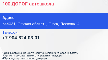 100 ДОРОГ, автошкола по адресу 644031, Омская область, Омск, Лескова, 4 в дальнейшем Организация, размещена в следующих категориях:
