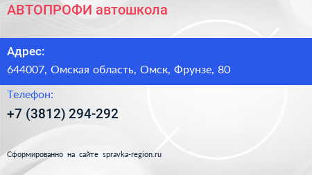 АВТОПРОФИ, автошкола по адресу 644007, Омская область, Омск, Фрунзе, 80 в дальнейшем Организация, размещена в следующих категориях: