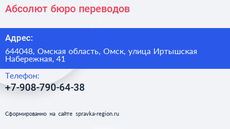 Абсолют, бюро переводов по адресу 644048, Омская область, Омск, улица Иртышская Набережная, 41 в дальнейшем Организация, размещена в следующих категориях: