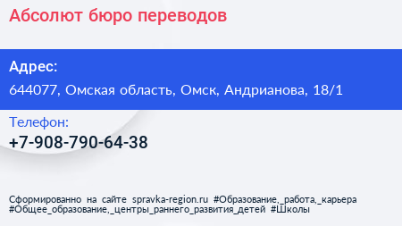 Абсолют, бюро переводов по адресу 644077, Омская область, Омск, Андрианова, 18/1 в дальнейшем Организация, размещена в следующих категориях: