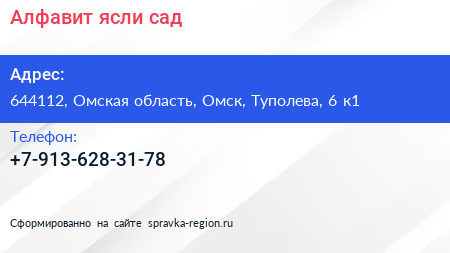 Алфавит, ясли-сад по адресу 644112, Омская область, Омск, Туполева, 6 к1 в дальнейшем Организация, размещена в следующих категориях: