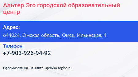 Альтер Эго, городской образовательный центр по адресу 644024, Омская область, Омск, Ильинская, 4 в дальнейшем Организация, размещена в следующих категориях: