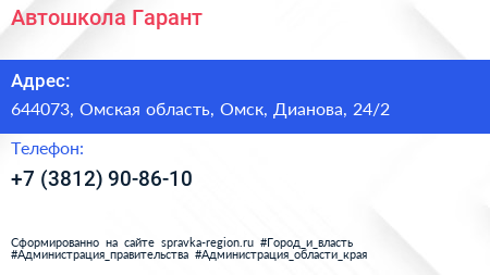 Автошкола Гарант по адресу 644073, Омская область, Омск, Дианова, 24/2 в дальнейшем Организация, размещена в следующих категориях: