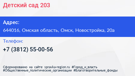 Детский сад №203 по адресу 644016, Омская область, Омск, Новостройка, 20а в дальнейшем Организация, размещена в следующих категориях: