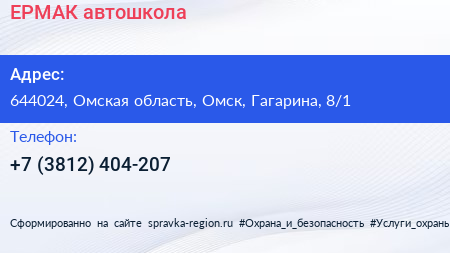 ЕРМАК, автошкола по адресу 644024, Омская область, Омск, Гагарина, 8/1 в дальнейшем Организация, размещена в следующих категориях: