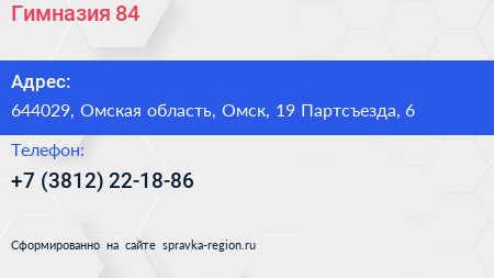 Гимназия №84 по адресу 644029, Омская область, Омск, 19 Партсъезда, 6 в дальнейшем Организация, размещена в следующих категориях: